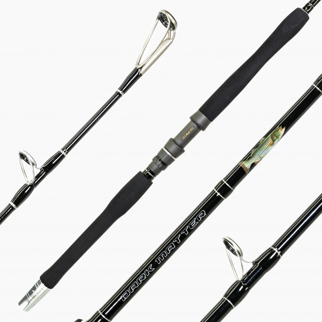 If you enjoy fishing mojos for big striped bass, then get a Dark Matter Mojo Trolling Rod! We sell a lot of Mojos and we wanted to create a go-to rod for any angler who wants to get started fishing mojos or more experienced anglers. The Dark Matter Mojo Trolling Rod is constructed of a carbon blank that is light in weight yet powerful enough to handle the weight of Mojos as well as fight a 40 lb striper! The entire rod weighs just 11.6 ozs. It has been outfitted with Fuji Alconite guides that are perfect for fishing braided lines. The heavy-duty Fuji DPS Reel seat can handle a bigger reel and it hasย second locking nut to make sure that even under crazy conditions your reel stays locked on the rod. The rod has custom EVA grips and an ALPs aluminum gimbal. The foregrip is long so you can get more leverage on the fish and have a more comfortable fight. If you troll mojos for striped bass, definitely use aย Dark Matter Mojo Trolling Rod. They are exactly what you need! You can troll single mojos and tandems with this rod.