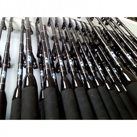 Sloopster F5 Trolling Standup Rods are black with carbon fiber wraps and a hint of silver.